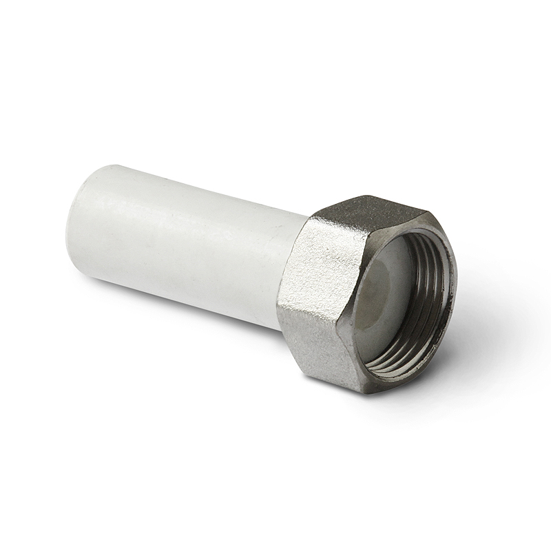 Фитинг предназначен для подсоединения к трубопроводу из полипропилена элемента системы с резьбовым подключением. Накидная гайка выполнена из латуни с никелевым покрытием. Резьба – внутренняя.