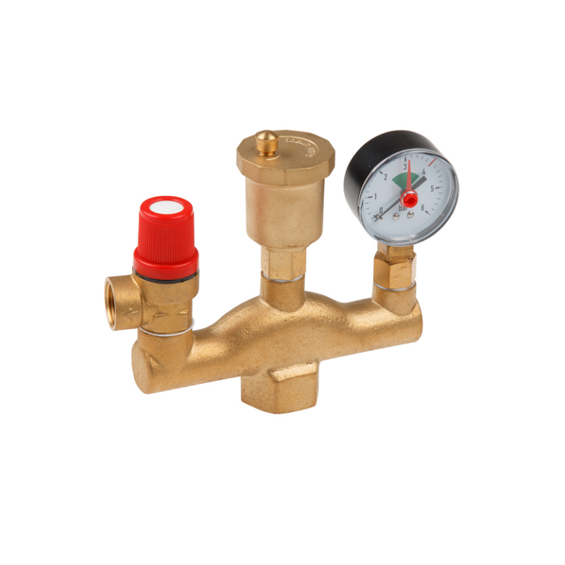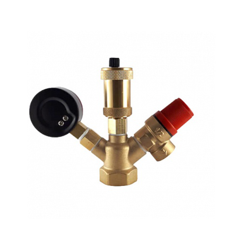 Группа безопасности котла предназначена для защиты от превышения давления в системе, выполняет функции отвода (сброса) из системы воздуха и газов. Встроенный манометр позволяет контролировать показания давления.